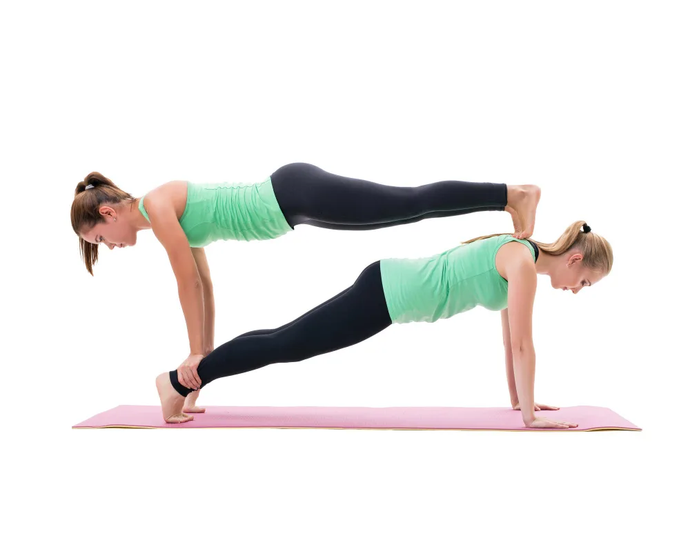 Bir partner güçlü bir plank pozisyonunda dururken, diğer partner dikkatli bir şekilde onun sırtına çıkarak bir plan daha oluşturur. Bu, büyük bir denge ve güç ister.